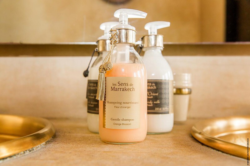 Bathroom with double sink in aged brass, large zellige and tadelakt bath open to the bedroom. A room where volume and softness add to the delicate comfort and elegant ambiance.